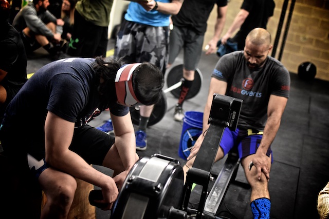 Men deadlift 225 lb. and throw 20-lb. ball to 10-ft. target